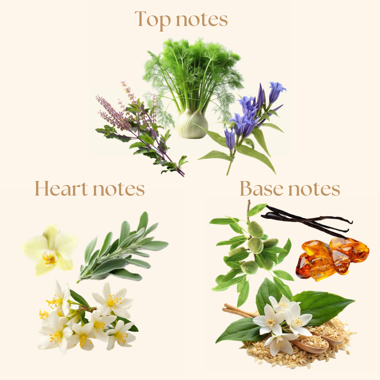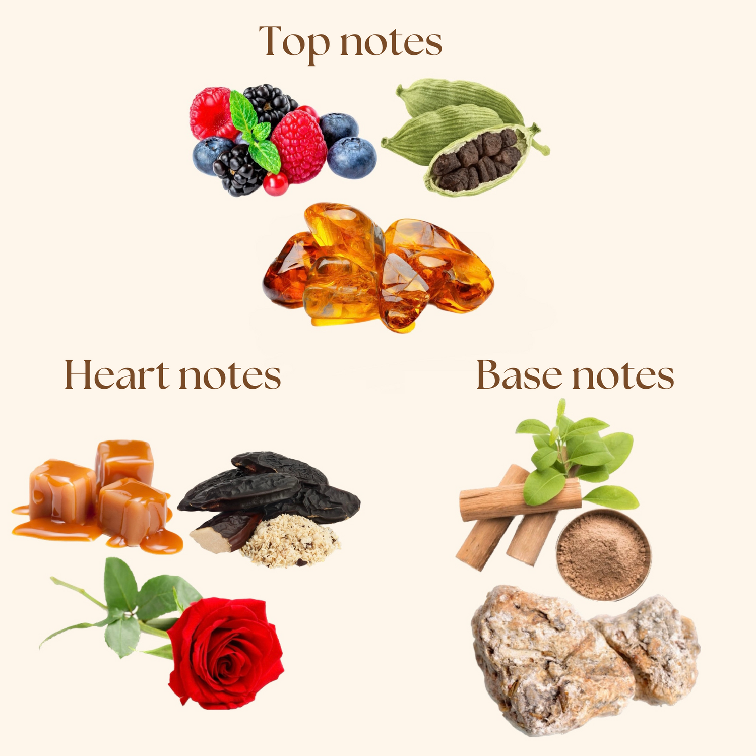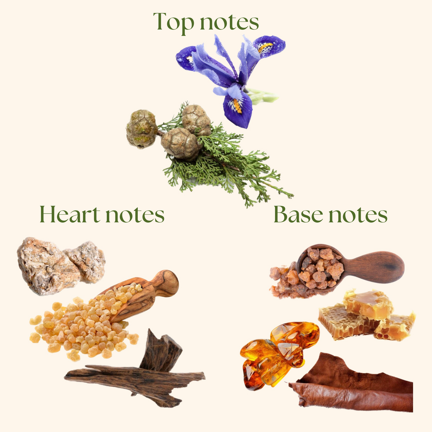 Heart notes: Frankincense, Labdanum, Balsam, Cedarwood